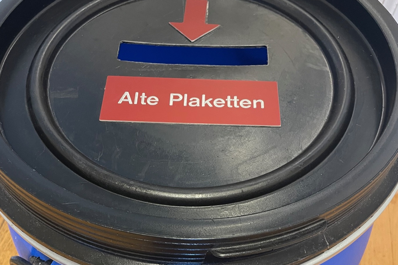 Auf der Geschäftsstelle des Fasnachts-Comité steht eine Sammeltonne. Ist die Tonne voll, werden die gesammelten Plaketten vom Produzenten der Plaketten der Firma René F. Müller AG abgeholt und fachgerecht entsorgt oder wiederaufbereitet.